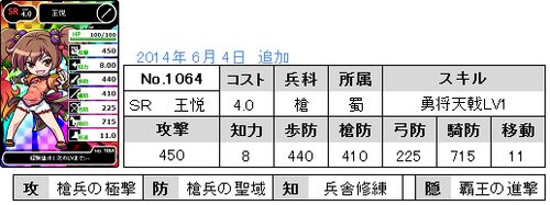 ブショーダス槍SP(2014年6月4~6月13日)でのみ排出 ~前回までのあらすじ~ (CV:界王さま) 樊城から流れ着いた奇妙な生命体SR関索(CV:セル) 嫁入りを迫られたSR王悦は槍神降臨によって関索を撃退する。 王悦 「どんなもんだー! ヽ(~□~*)ノ 」 「……(o_ _)…