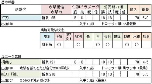 刀 研ぎ澄まされた刃を持つ異国の武器。 曲剣と同じく鋭石タイプの強化派生を持つ武器で、曲剣をさらに上回る攻撃力を持っているのが特徴。 ただしアクションは曲剣より攻撃の速さで少し劣るため、実際のところ曲剣より強い武器かと言えば微妙なところ。 む…